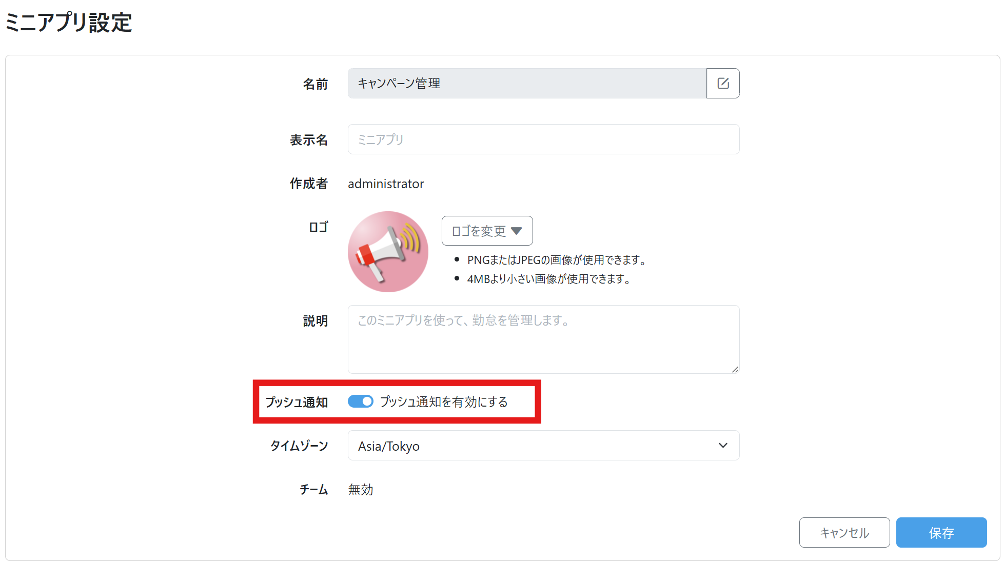 プッシュ通知を有効にするには、Platio Studioのミニアプリの設定で「プッシュ通知を有効にする」をオンにして保存し、ミニアプリを再度配布します。