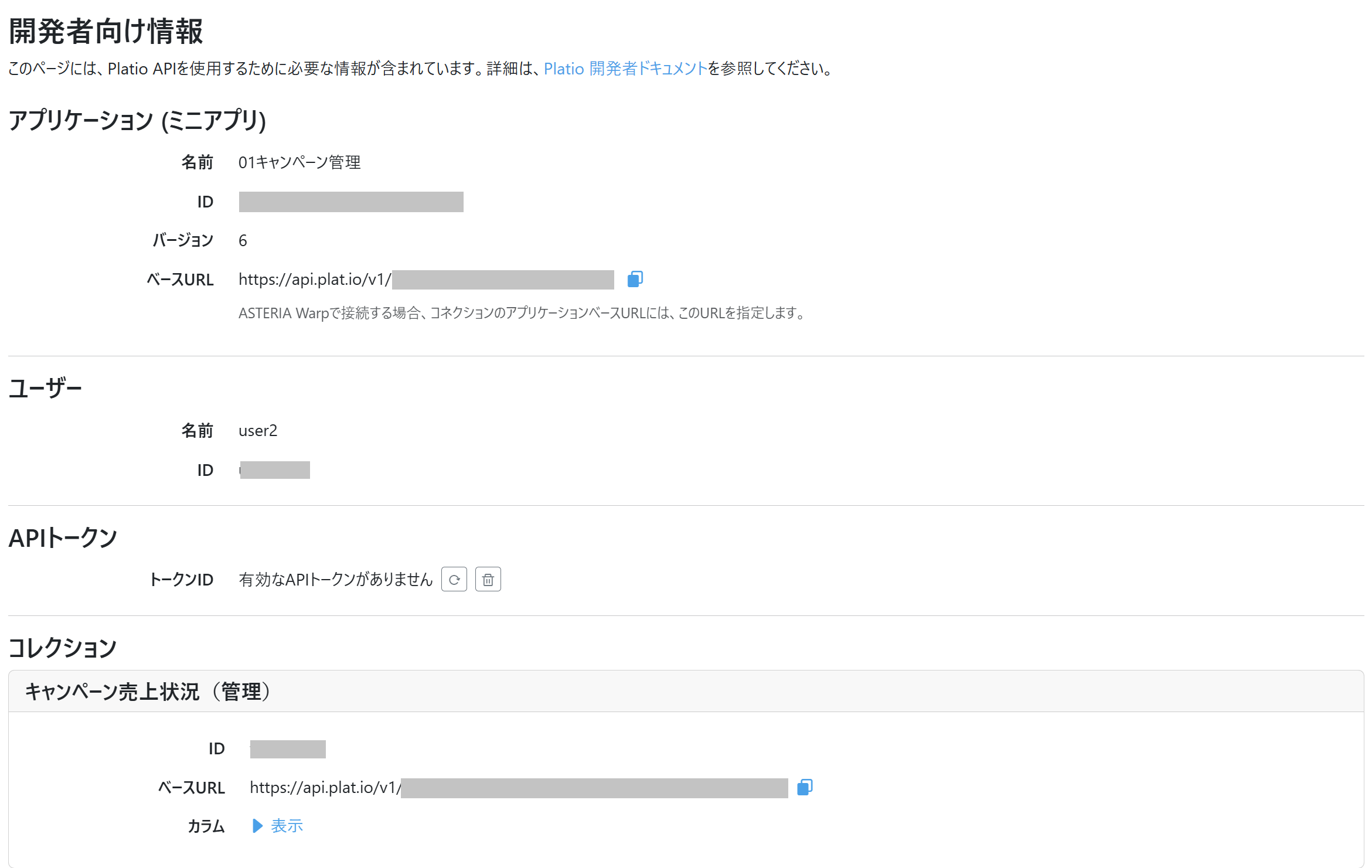 開発者情報を表示するには、Platio Studioでミニアプリのユーザー情報で「APIでのレコードや添付ファイルへのAPIでのアクセスを許可」の設定をオンにしてください。