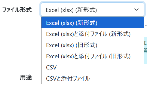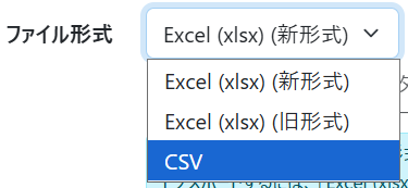 Excel (xlsx) (新形式) / Excel (xlsx) (旧形式) / CSVを指定できます。インポートに利用する場合は「CSV」を選択します。