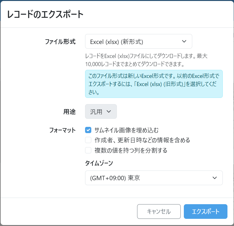 - ファイル形式がExcelの場合、画像系フィールドのサムネイル画像を埋め込んでエクスポートできます。