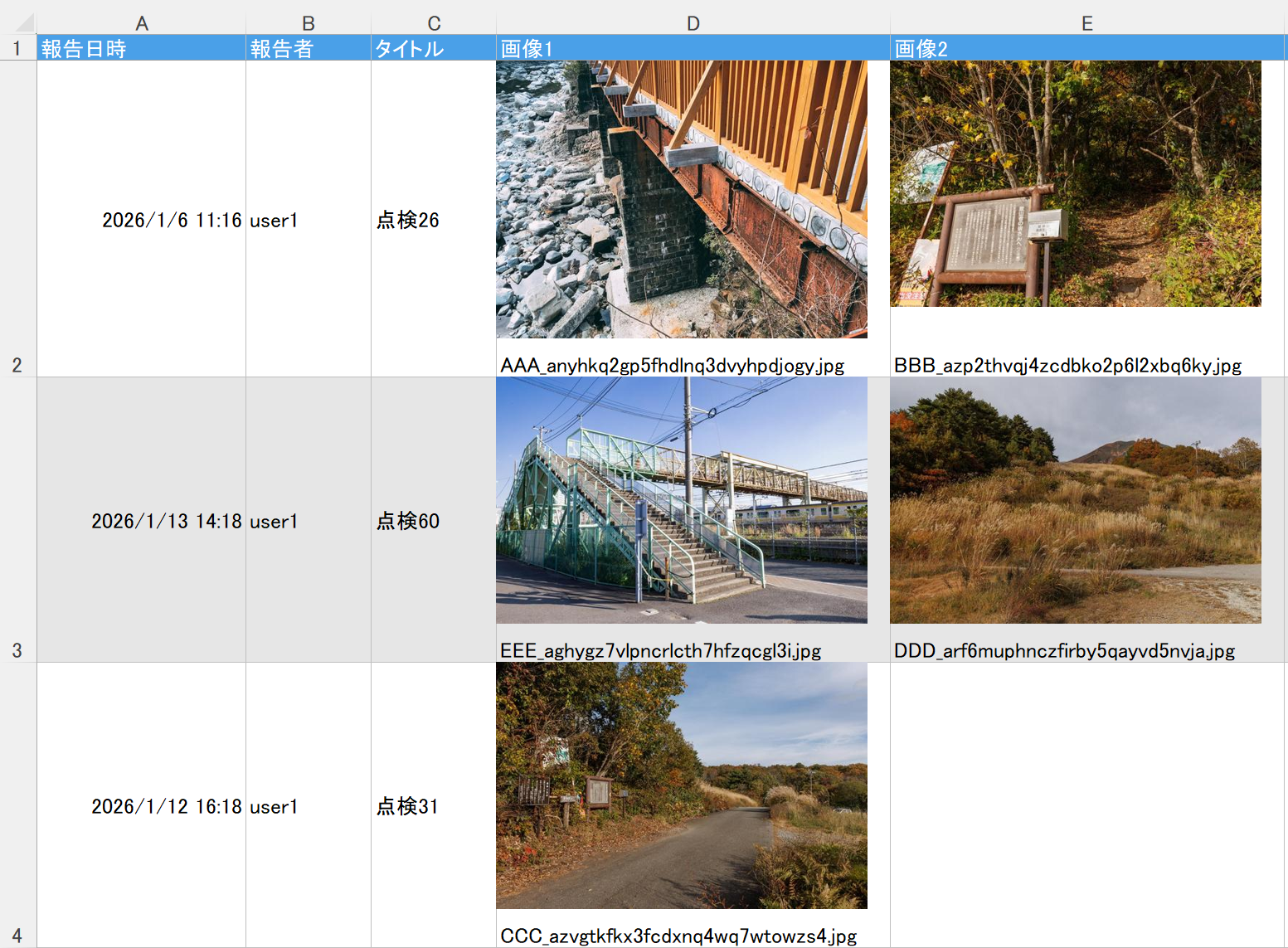 各フィールドが出力されます。メディア系(添付ファイル)フィールドは、attachmentsフォルダーに保存された添付ファイル名で出力されます。