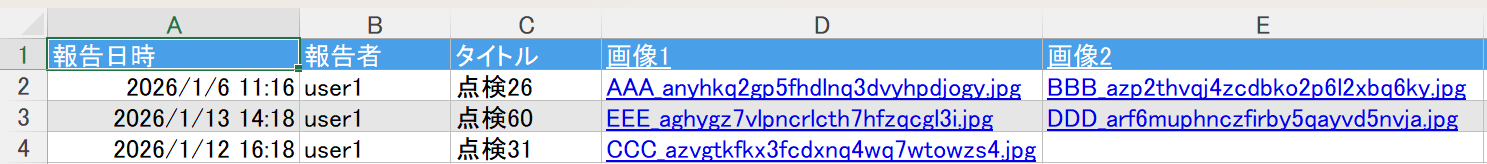 上記の各フィールドと、追加で"作成者"、"作成日時"、"更新者"、"更新日時"が出力されます。