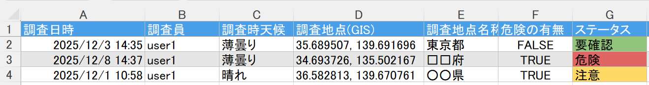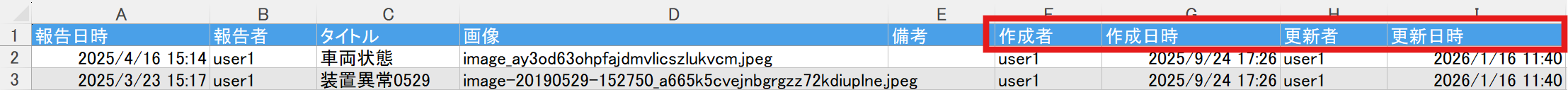 "作成者"、"作成日時"、"更新者"、"更新日時"の列が追加されて出力されます。