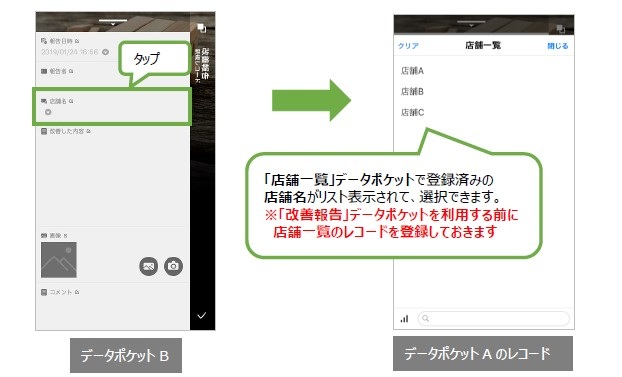 - データポケットB(前述例では「改善報告」データポケット)を使うときにデータポケットAのフィールドを参照してデータを登録する。