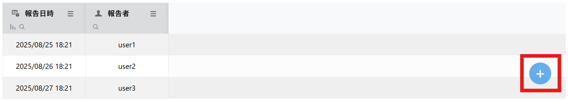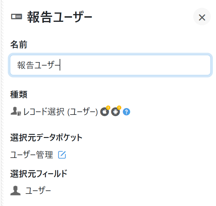「報告ユーザー」レコード選択フィールドの選択元は、「ユーザー管理」データポケットのユーザーフィールドです。