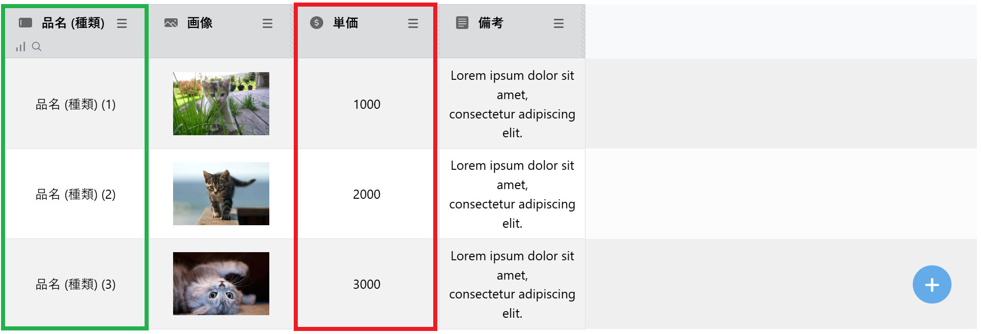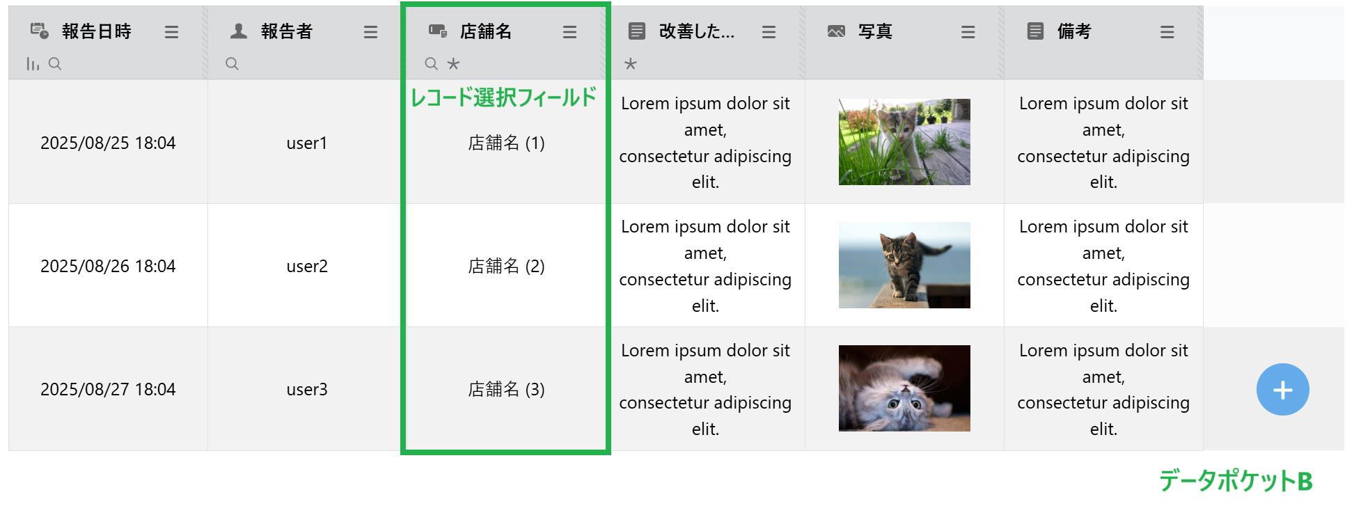 報告日時, 報告者, 店舗名, 改善した内容, 写真, 備考このデータポケットで3番目のフィールドの「店舗名」を入力するとき、主に以下の方法があります。