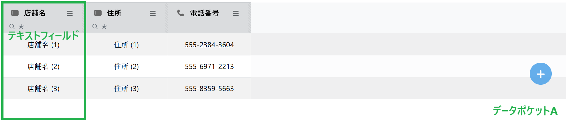 ②データポケットBを作成します。店舗名のフィールドの追加で「+」をクリックします。