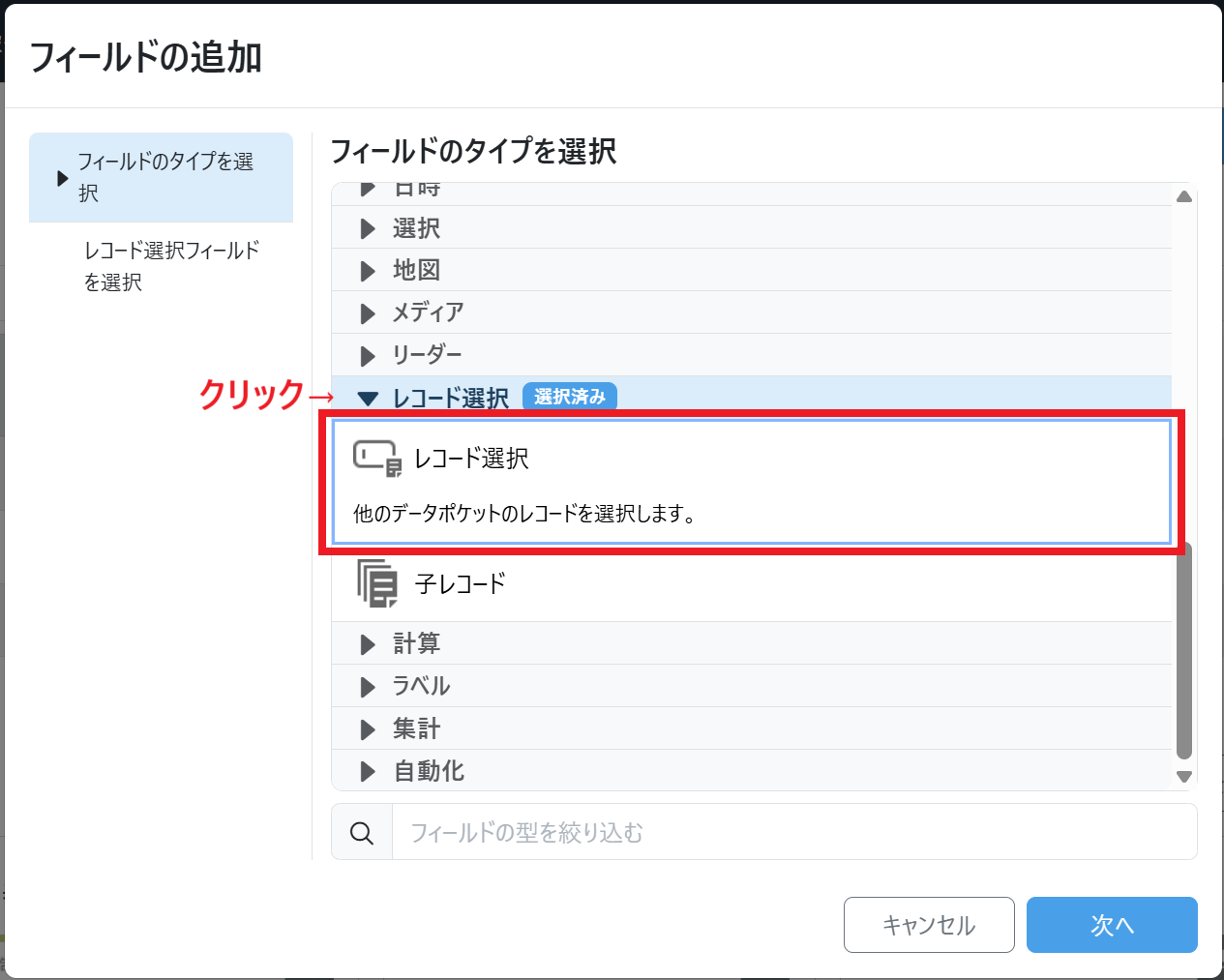 レコード選択フィールドの追加手順