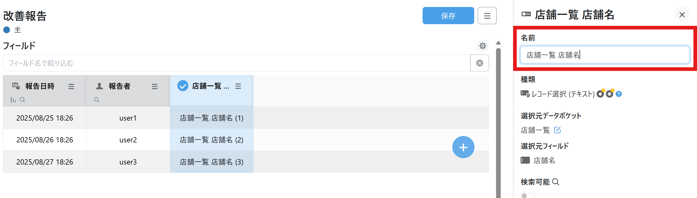 例の「改善報告」データポケットで「レコード選択」フィールドを使うには、「改善報告」データポケットとは別で、店舗情報を管理する「店舗一覧」データポケットを先に作成して以下のようにレコードを登録します。