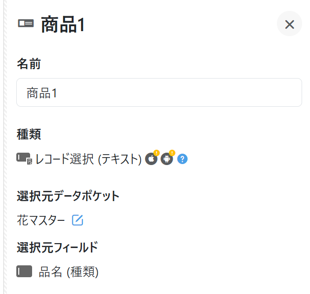 「商品1」レコード選択フィールドで、選択元を「花マスター」データポケットの「品名 (種類)」テキストフィールドに設定しています。