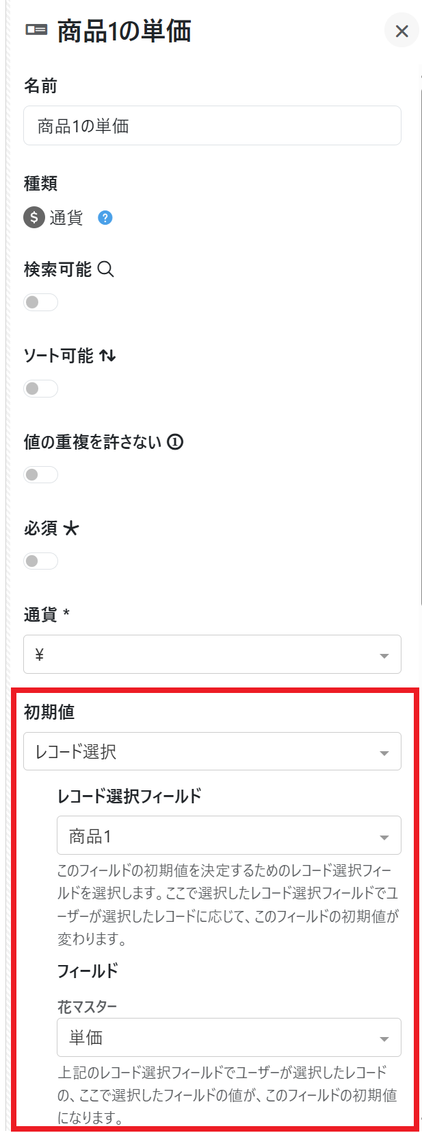 ここで、「商品1」フィールドで、「花マスター」データポケットの”品名(種類)”を選択したら同じレコードの”単価”を「商品1の単価」フィールドに自動で入力するように初期値を設定できます。