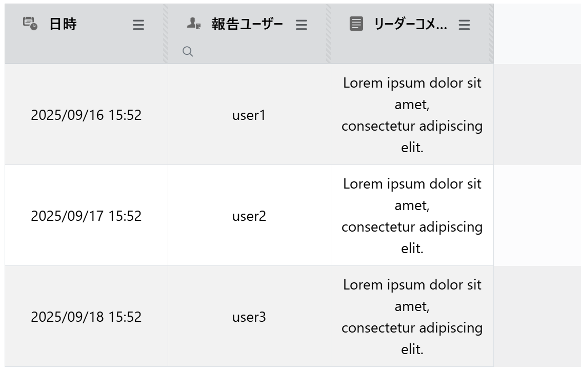 別の「日報」データポケットで、「ユーザー管理」データポケットのユーザーフィールドを選択元にしたレコード選択フィールド「報告ユーザー」を作成します。報告ユーザーがリーダーの場合に、リーダーとしてコメントを入力する複数行テキストフィールドがある場合に、複数行テキストフィールド「リーダーコメント」の条件付き表示プロパティで、ユーザーのスイッチがオンの場合に表示するように指定できます。