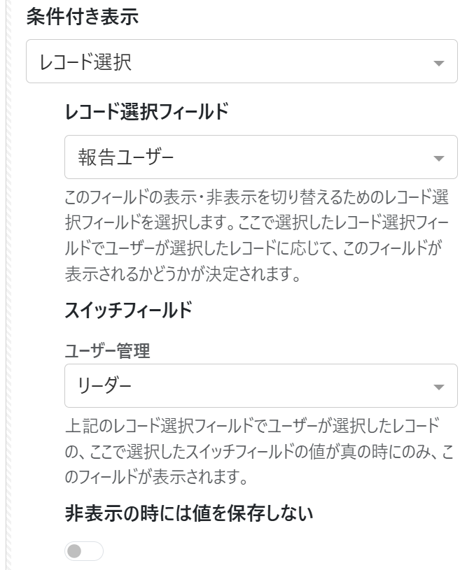 条件付き表示プロパティでは、フィールドを表示する条件、またはフィールドを表示しない条件を設定してフィールドの表示/非表示を指定することができます。