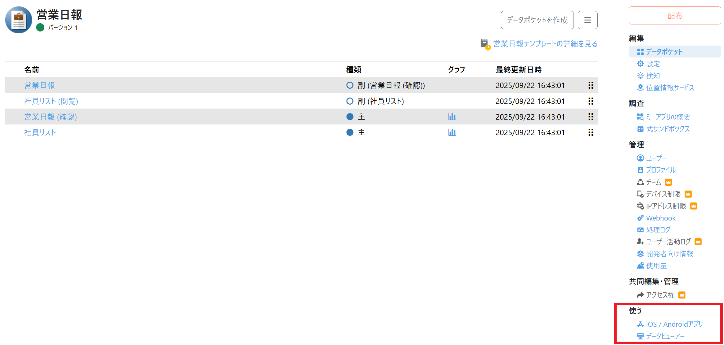 ミニアプリのデータビューアーへのリンクです。クリックすると、データビューアーの画面が表示されます。