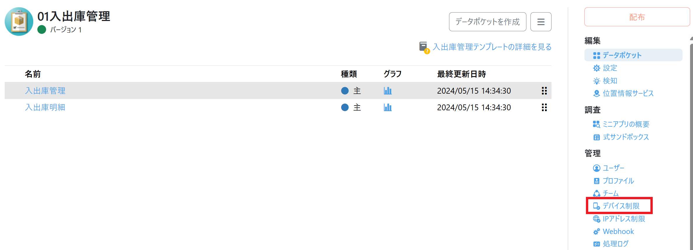 デバイス制限を有効にするには、ミニアプリ画面の管理メニューで「デバイス制限」をクリックします。