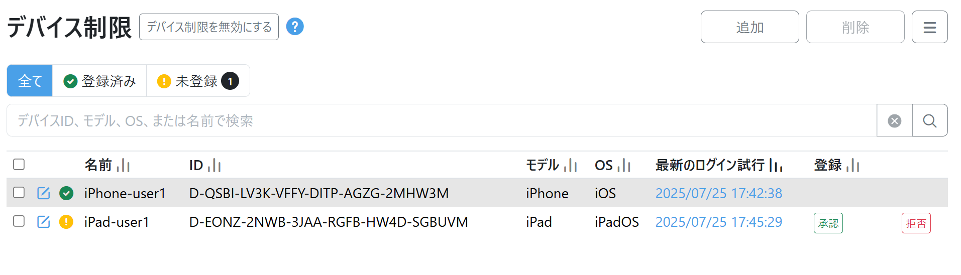 許可しないデバイスの場合は「拒否」で登録しないようにします。