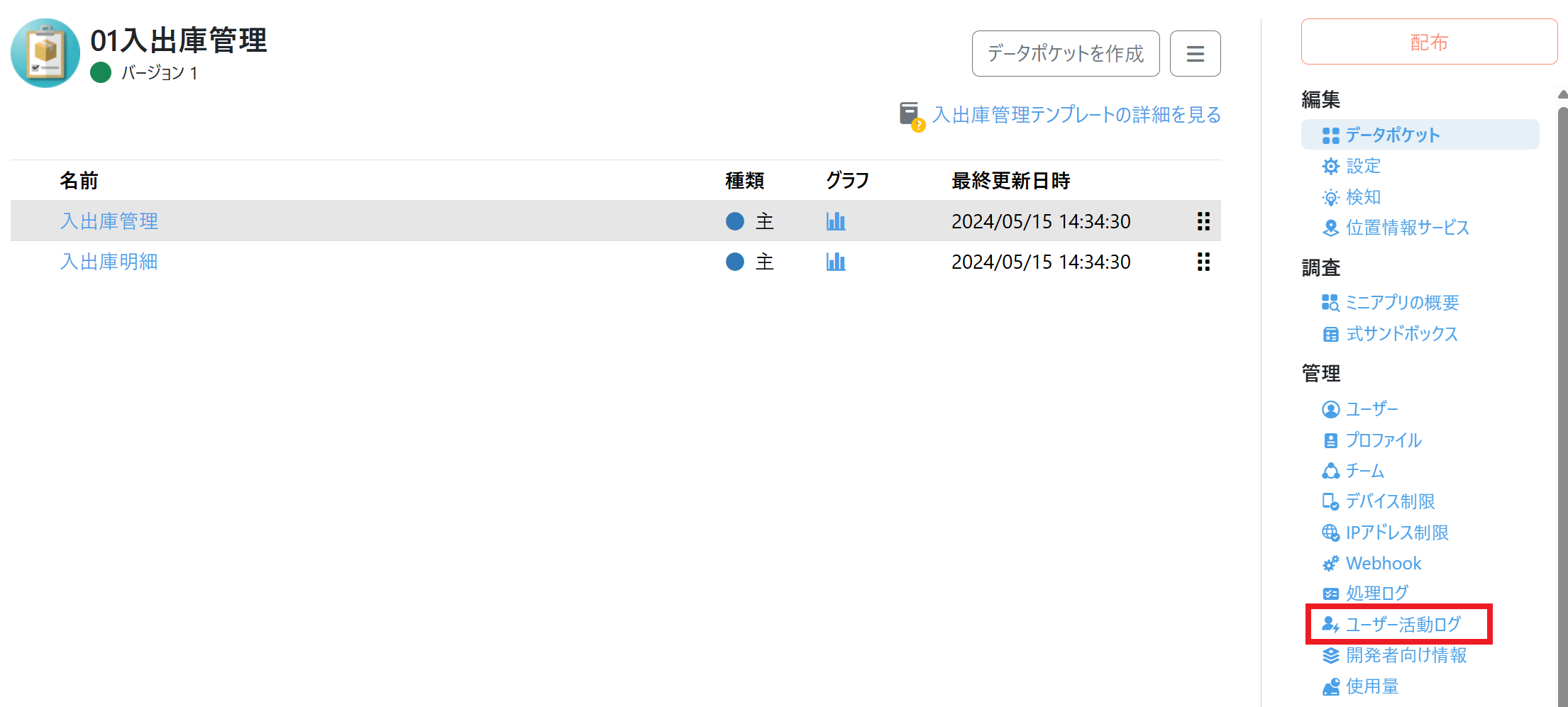 ユーザー活動ログを有効にするには、ミニアプリのデータポケット一覧画面の管理メニューで「ユーザー活動ログ」をクリックします。