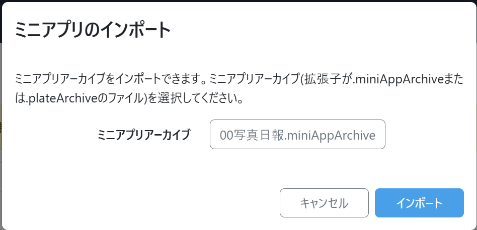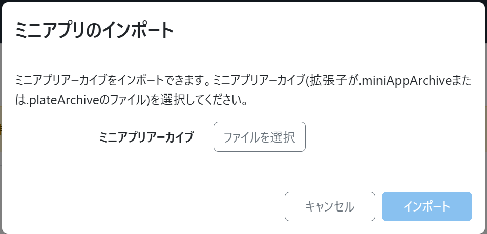 - 別の組織で同じミニアプリを利用したいときに、ミニアプリファイルをインポートする