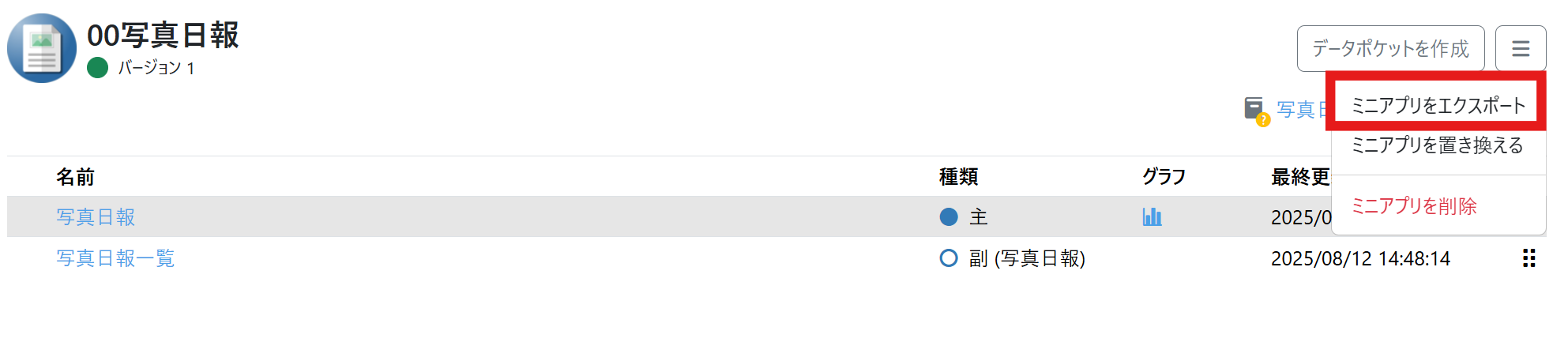 Platio Studioのミニアプリ画面で、データポケット一覧右上にあるミニアプリメニューをクリックし、「ミニアプリをエクスポート」をクリックします。すぐにミニアプリファイル(ファイル拡張子.miniAppArchive)のダウンロードが開始されます。