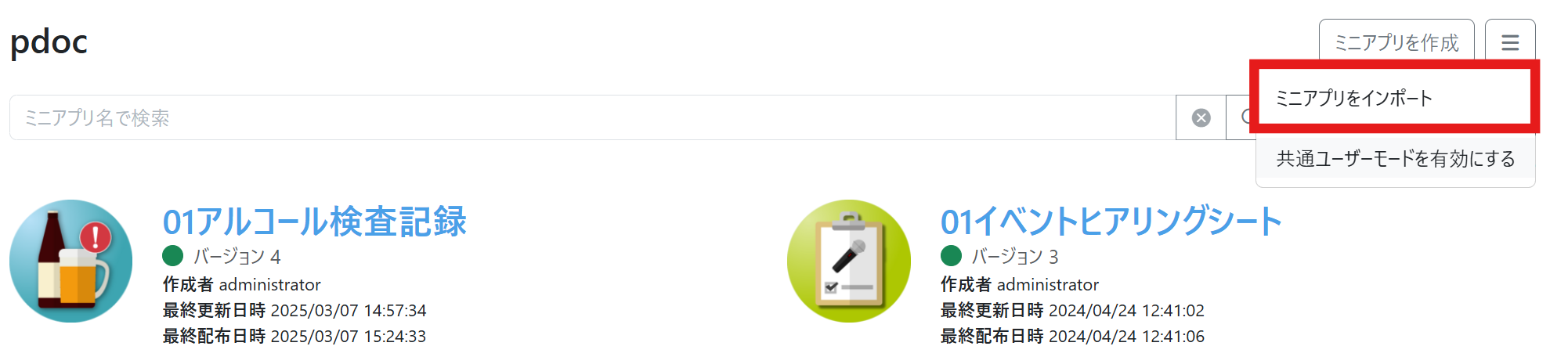 同じ名前のミニアプリをインポートすると、名前の末尾に採番の数字が自動で付加されます。例えば、テストというミニアプリが存在する状態でテストというミニアプリをインポートすると、テスト2という名前で作成されます。