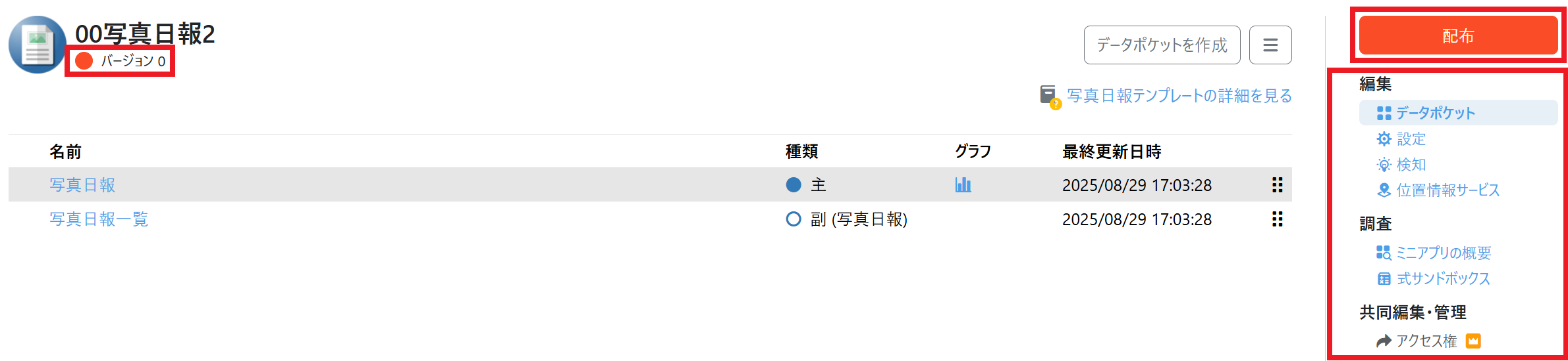 ミニアプリをインポートするとミニアプリ画面が表示されます。未配布の状態になっていて、下図のようにデータポケット一覧で右側に「管理」メニューは表示されません。ユーザーを追加する等の管理操作を行うには、「配布」をクリックしてミニアプリを配布完了した状態にしてください。