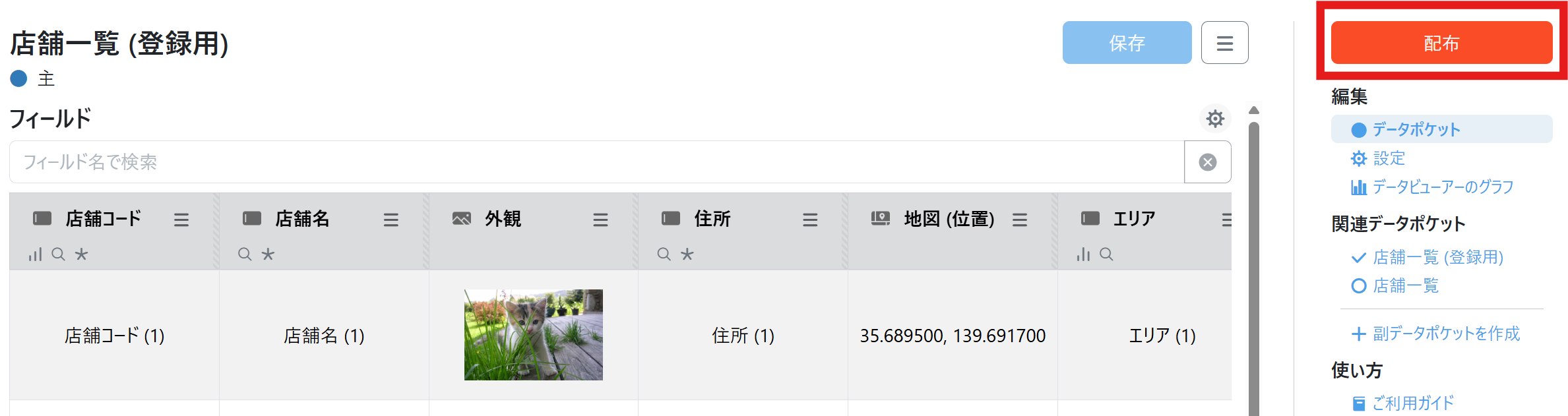 データポケット画面でデータポケットを編集すると、上部右上の「配布」ボタンがクリックできるようになります。