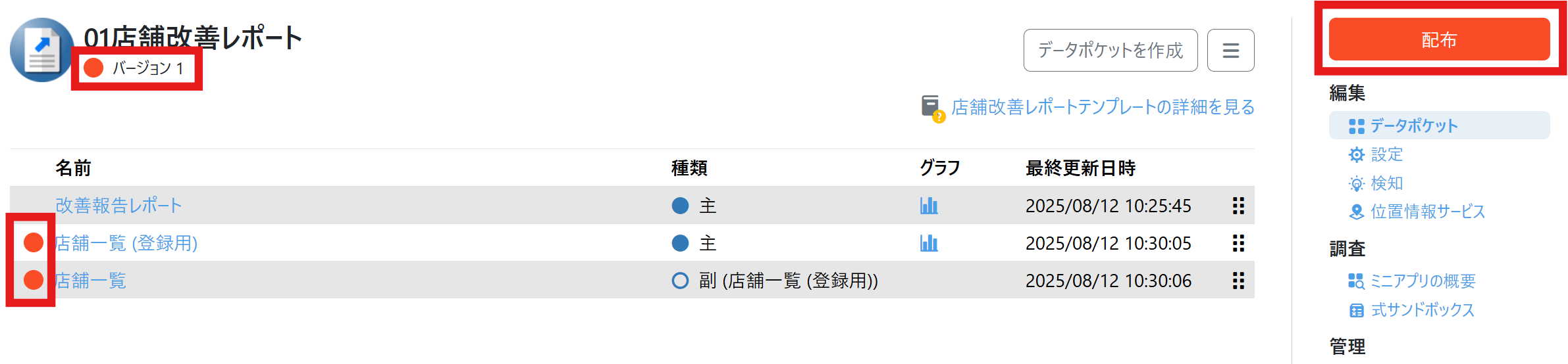 ミニアプリがアクセス可能な状態にすることを「配布」といいます。データポケットを編集するなどミニアプリに変更があった場合は、ミニアプリを配布して、データビューアーやモバイル端末のPlatioアプリで利用できるようにします。