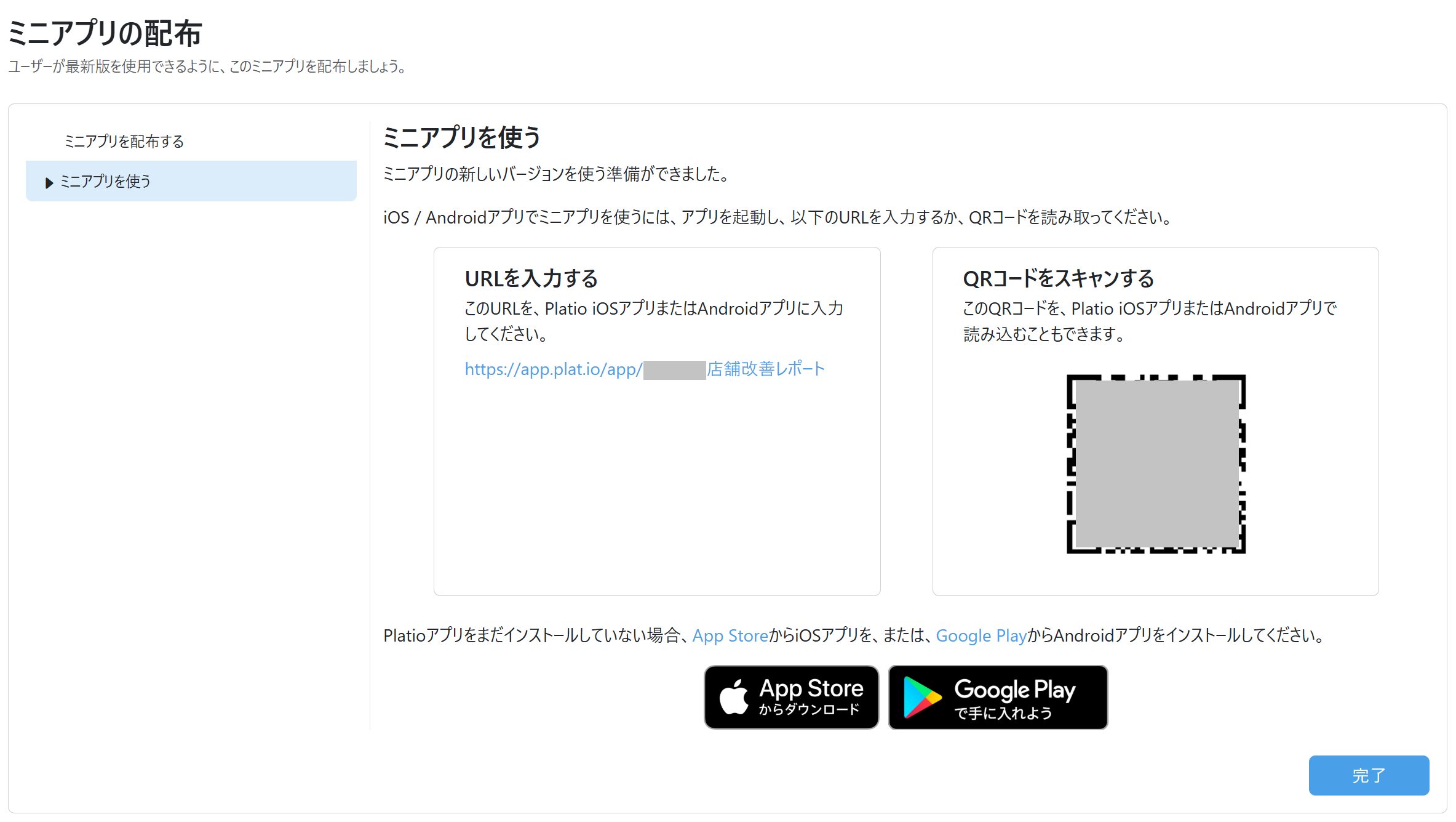 ミニアプリへアクセスするQRコードやリンクが表示されます。「完了」をクリックすると、元の画面に戻ります。「ユーザーの管理」をクリックすると、ユーザー画面が表示されます。