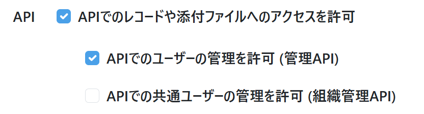 このユーザーがAPIでのユーザーの管理を操作することを許可するかどうかを指定します。「レコードや添付ファイルへのAPIでのアクセスを許可」をオンにすると設定できるようになります。