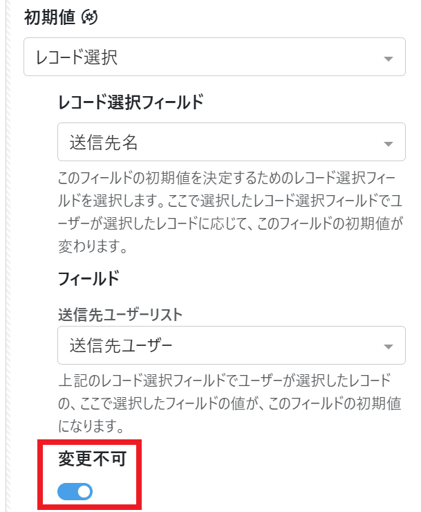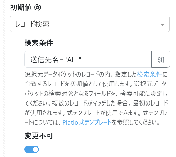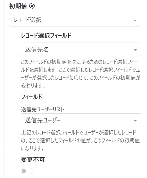 ここまでのレコード選択と初期値プロパティを利用した設定を応用して、送信先のユーザーをPlatioアプリから固定にし、また変更させないようにすることができます。