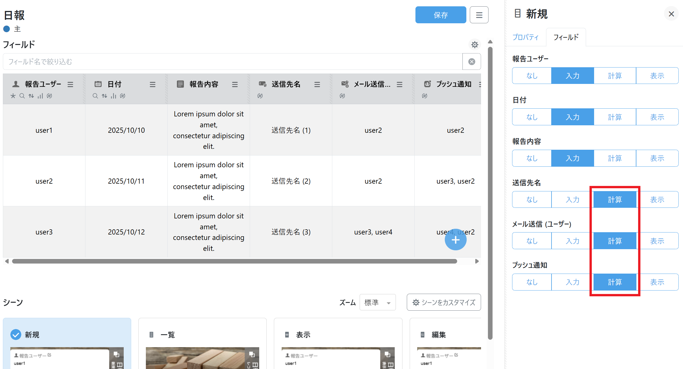 その場合は、新規・編集・表示の各シーンの設定で、フィールドを非表示にして初期値を動作させる「計算」を選択します。