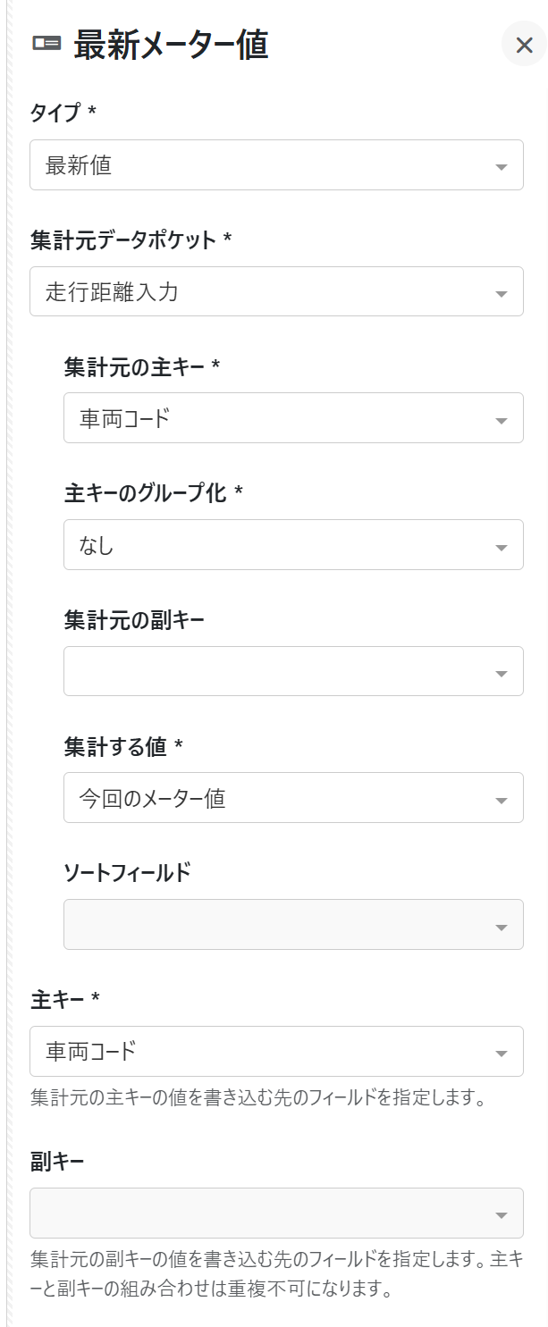 ・最新メーター値:集計フィールドプロパティを設定します。下図のようにタイプに「最新値」を設定します。