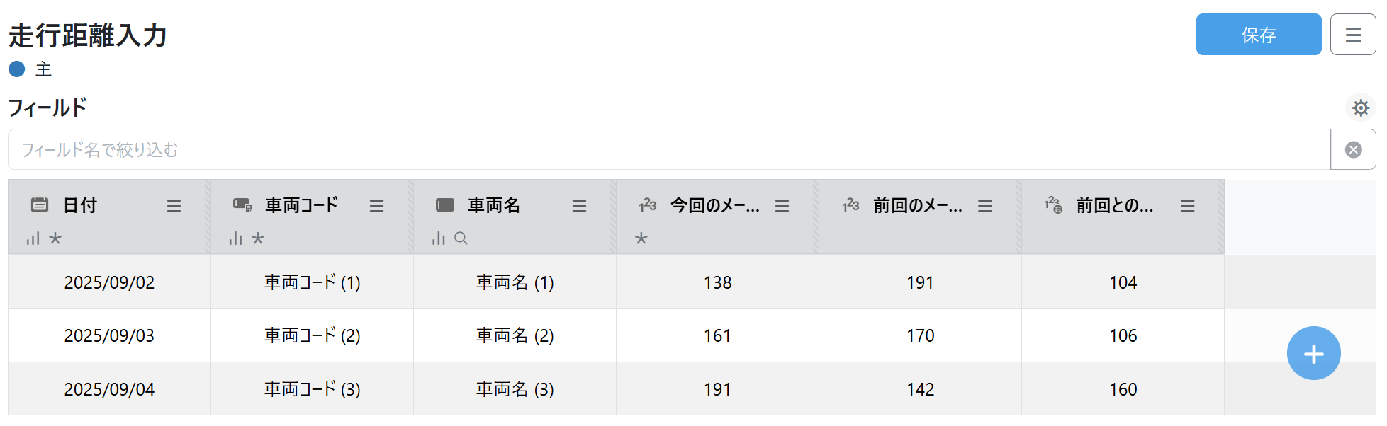 ここでは、車両管理でメーター値の前回の値を参照して差分を記録するミニアプリを作る手順で集計機能を説明します。