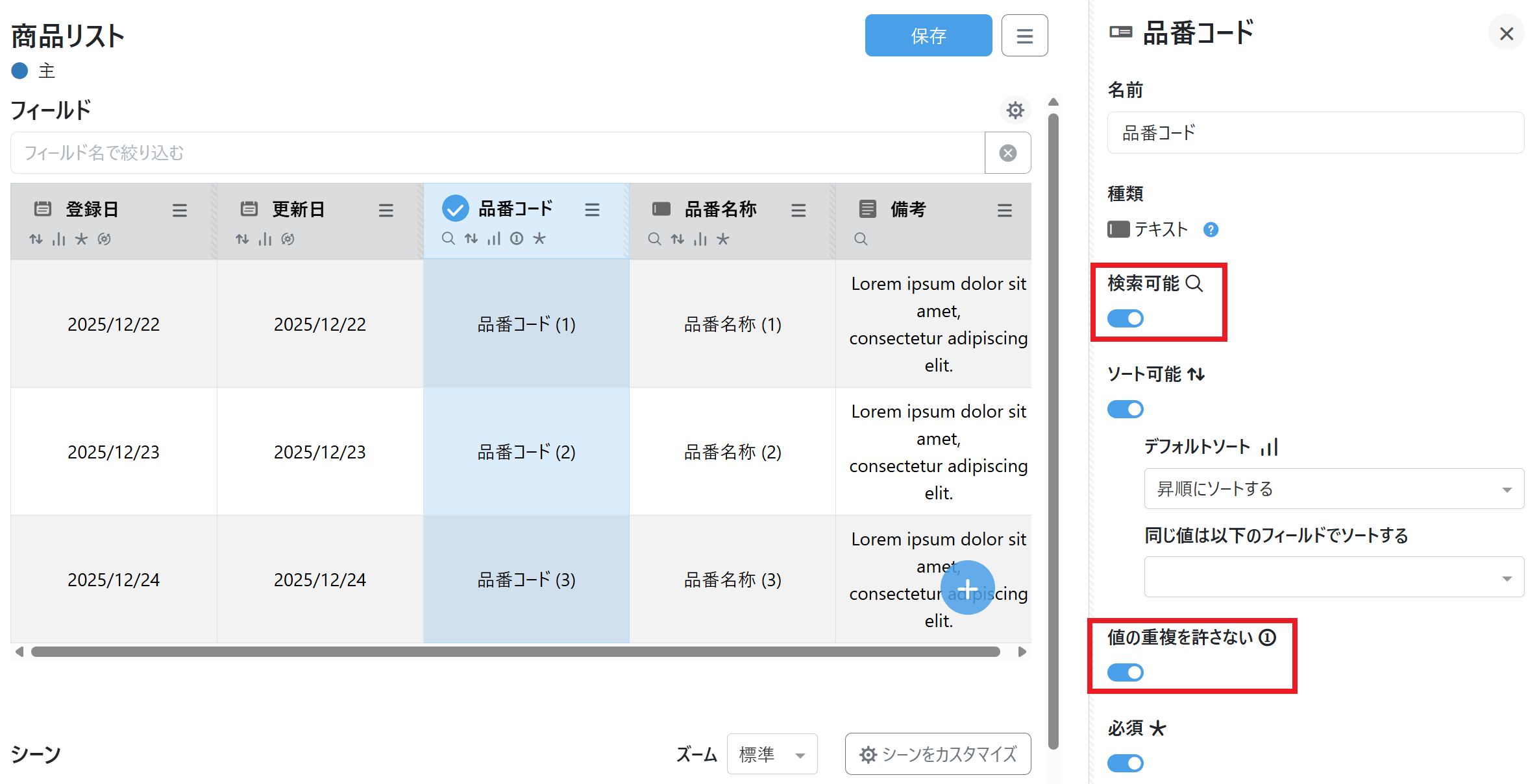以下のキャプチャのように「検索可能」と「値の重複を許さない」にチェックを入れる。