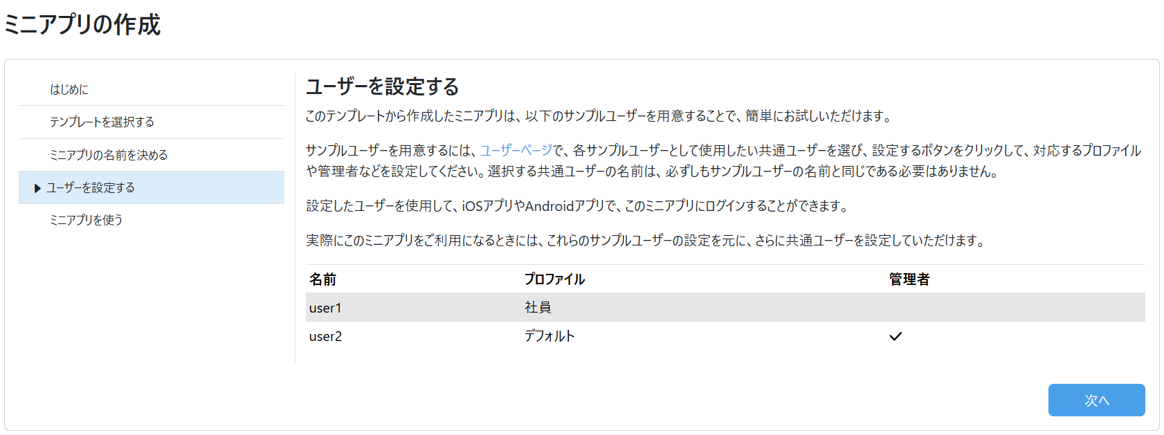 テンプレートからミニアプリを作成するウィザードを進めると、以下のようにユーザーの設定について説明があります。ここでは、共通ユーザーが無効の状態のときのようにユーザーは追加されません。