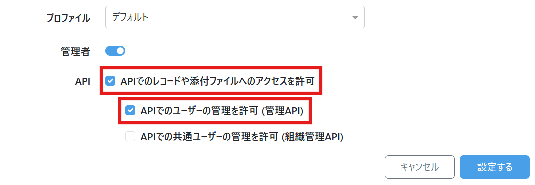 操作としては、勤怠連絡ミニアプリの管理メニュー「ユーザー」から、User4の「設定する」ボタンをクリックして、勤怠連絡ミニアプリにユーザー(User4)を設定します。このときユーザーの編集画面が開くので「APIでのレコードや添付ファイルへのアクセスを許可」と「APIでのユーザーの管理を許可(管理API)」にチェックを入れて保存します。