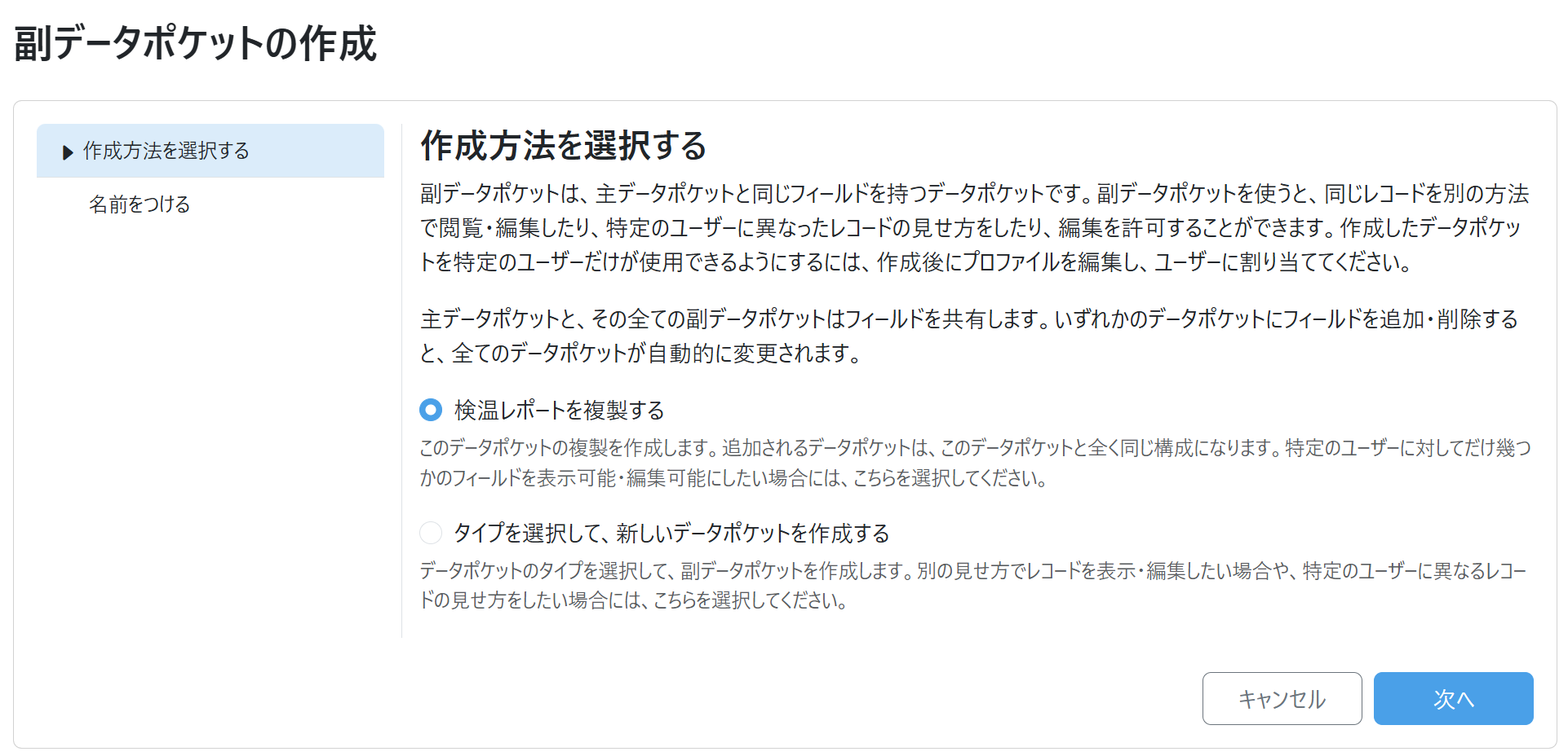 データポケットのタイプは同じで作成するので、「(データポケット)を複製する」を選択して「次へ」をクリックし、名前をつけて作成します。この例では、データポケットの名前を「検温レポート(削除不可)」にします。