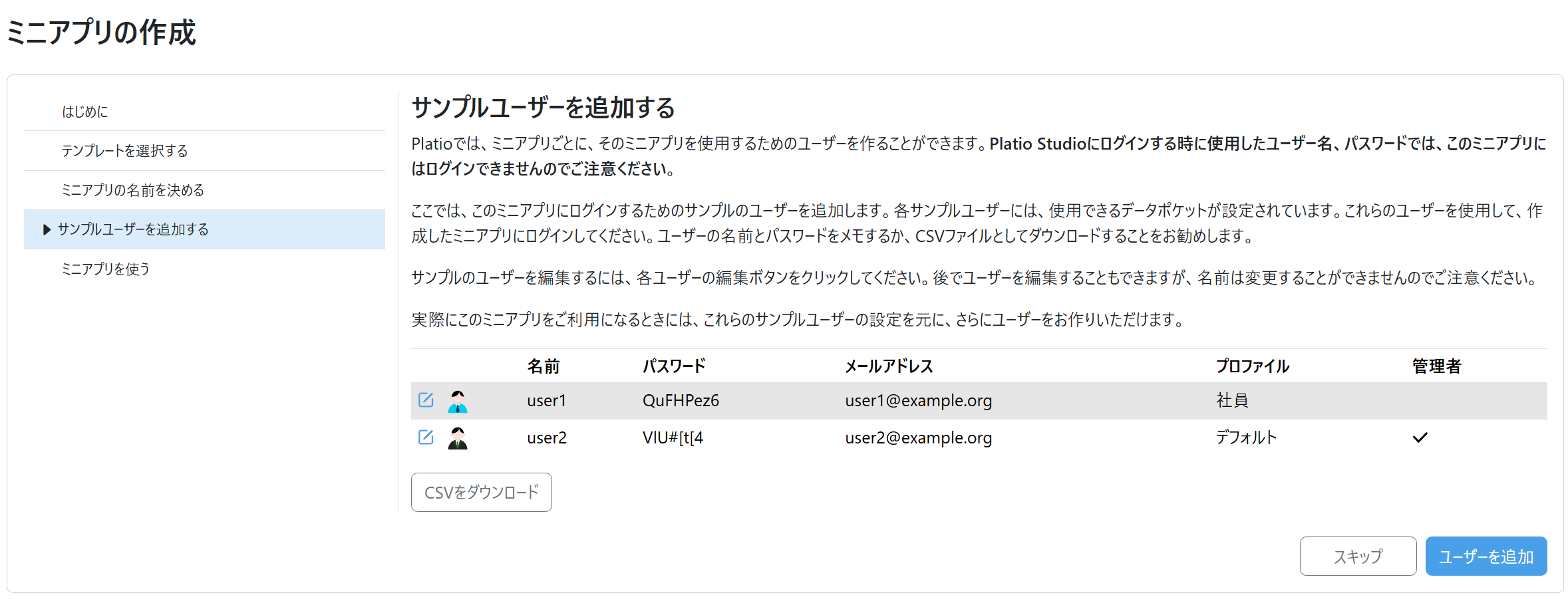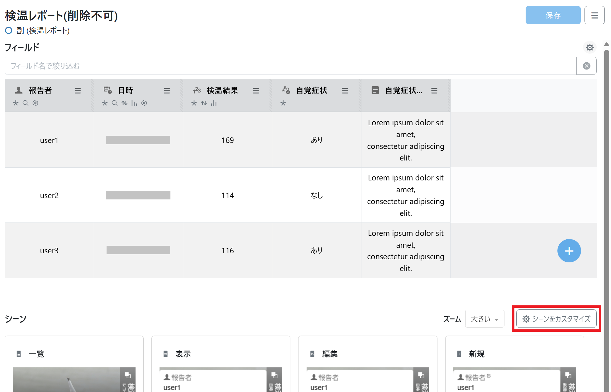 この例では、テンプレート「検温レポート」を利用して、副データポケットを追加し、ユーザーuser1は削除不可、user2は削除可能にするプロファイルを設定したミニアプリへ更新します。
