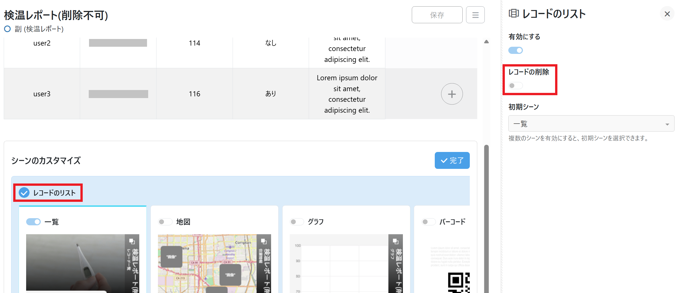 「レコードのリスト」をクリックしてプロパティを表示し、「レコードの削除」をオフにします。「×」をクリックしてプロパティを閉じ、「完了」をクリックしてシーン画面に切り替えます。