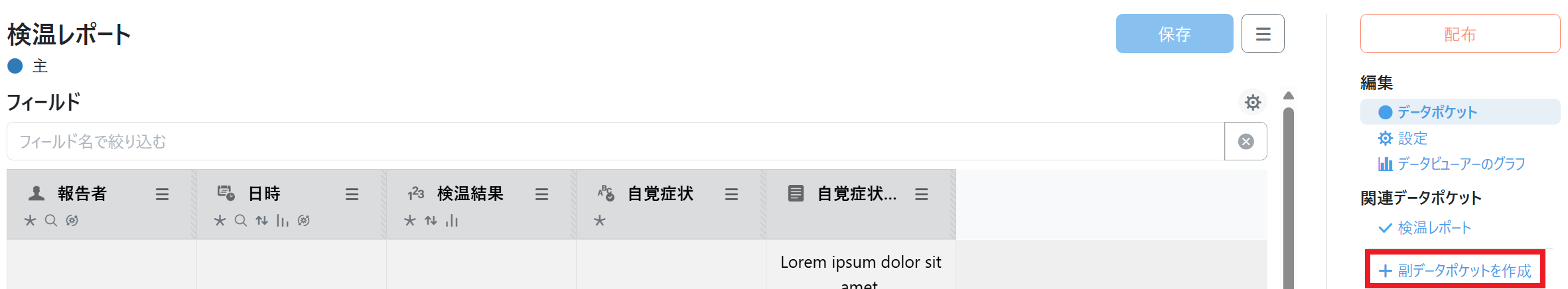 データポケット画面の右メニュー「関連データポケット」の「+副データポケットを作成」から副データポケットを作成します。