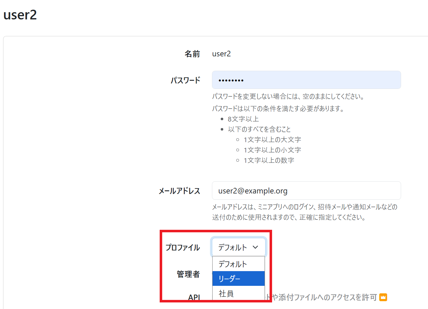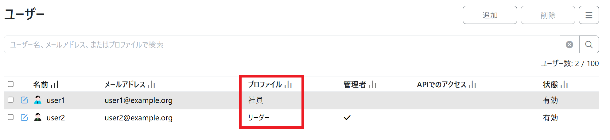 編集画面で「プロファイル」をクリックし、作成したプロファイル「リーダー」を選択して保存します。