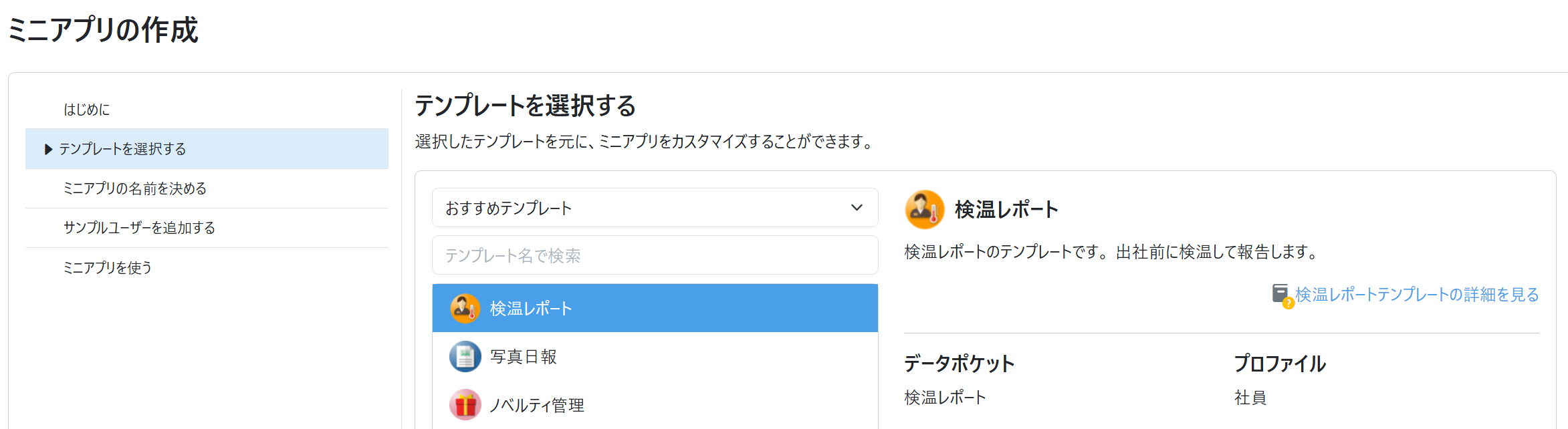 最初に、テンプレート「検温レポート」からミニアプリを作成します。手順はガイド「ミニアプリを作成」を参照してください。