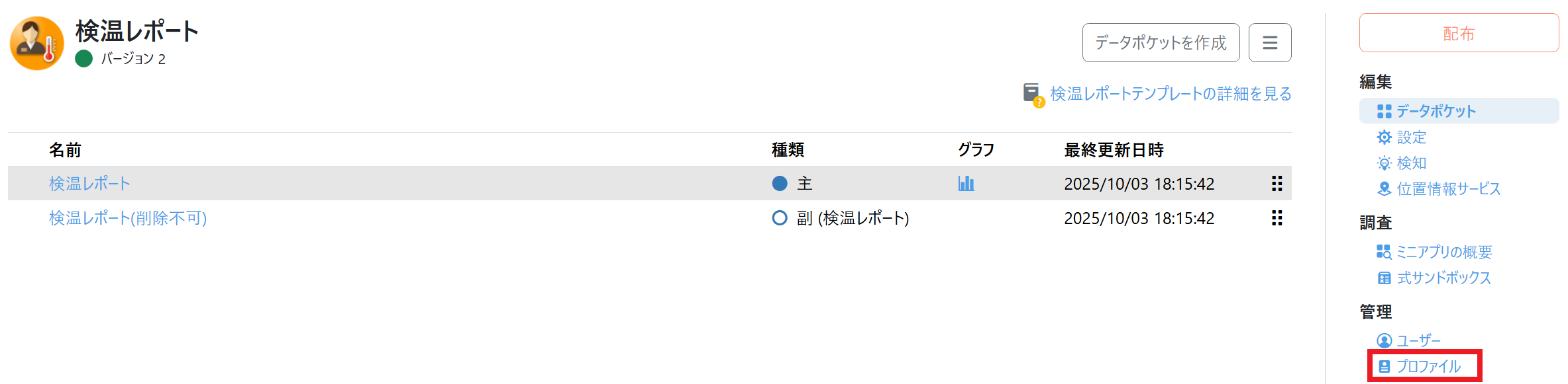 「検温レポート」ミニアプリでは、すでにプロファイルが作成されていますので、これを編集します。