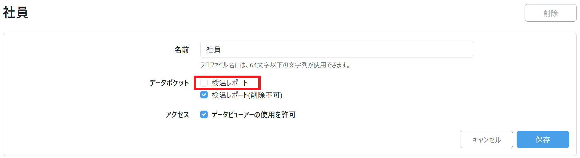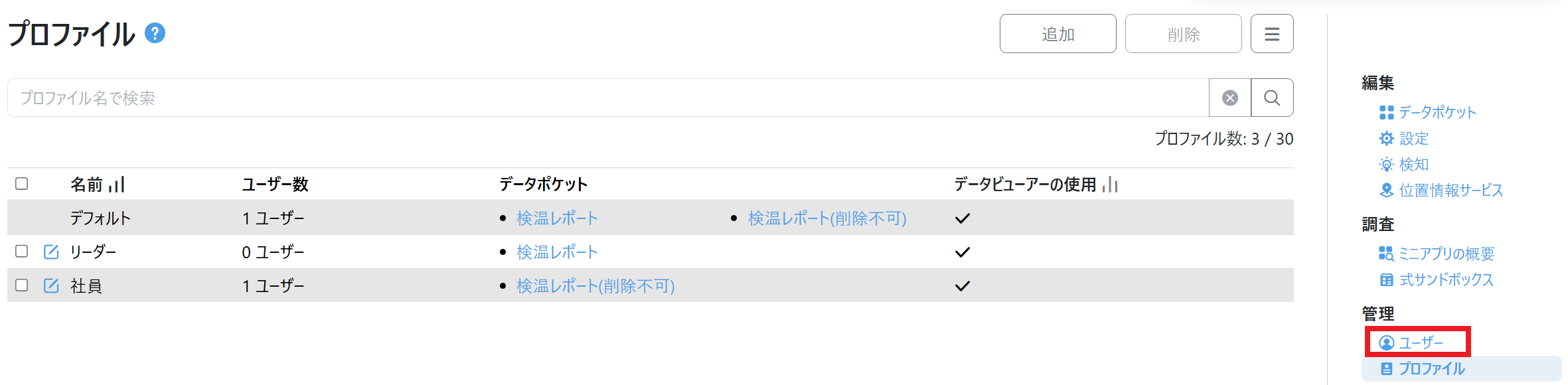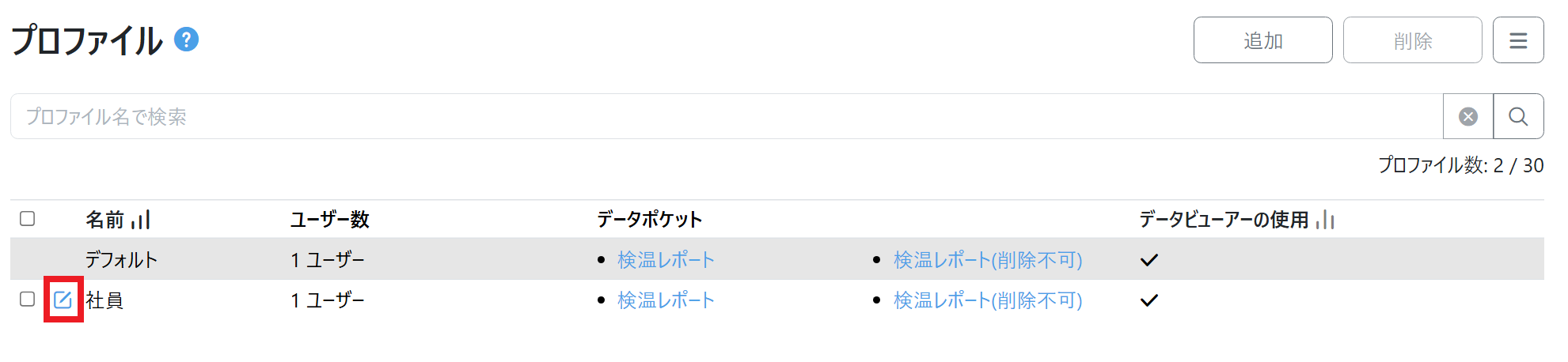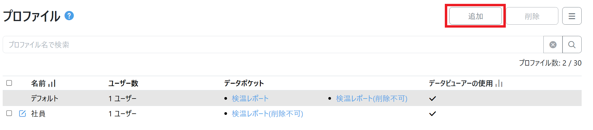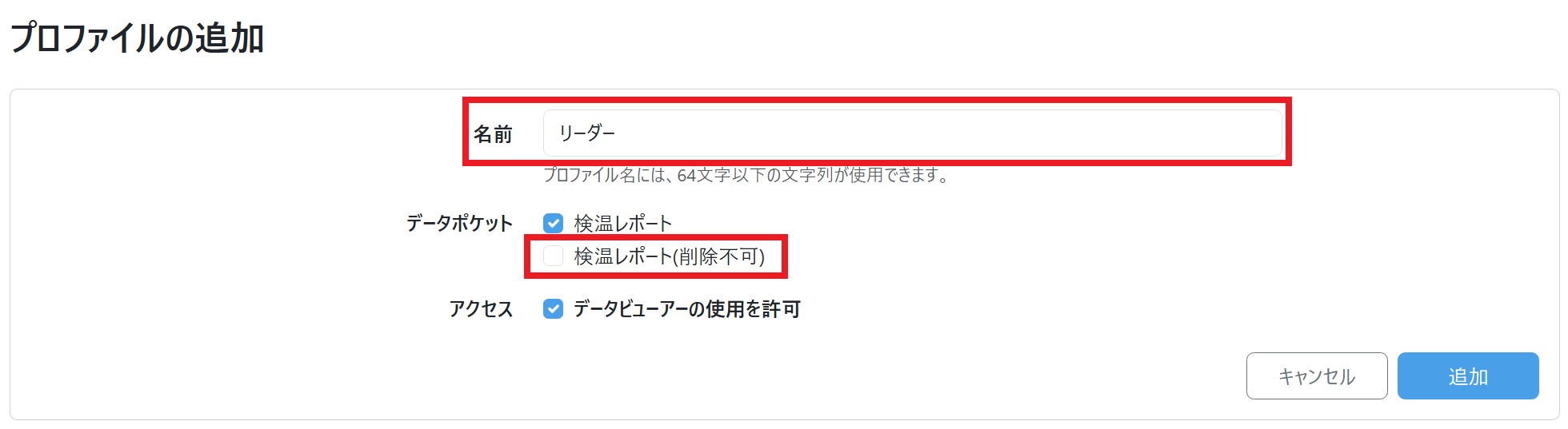 プロファイルの追加画面で、この例では、プロファイルの名前を「リーダー」として、主データポケットの「検温レポート」のみを選択して「追加」をクリックします。