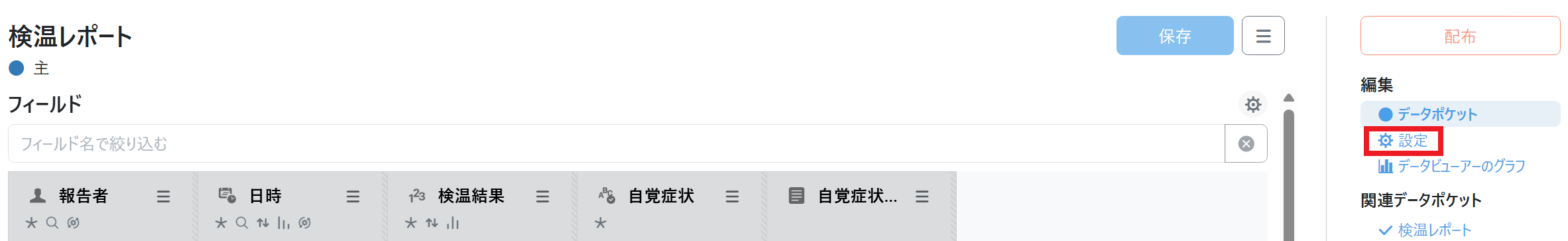 レコードの権限を設定するには、データポケット画面の「設定」をクリックします。
