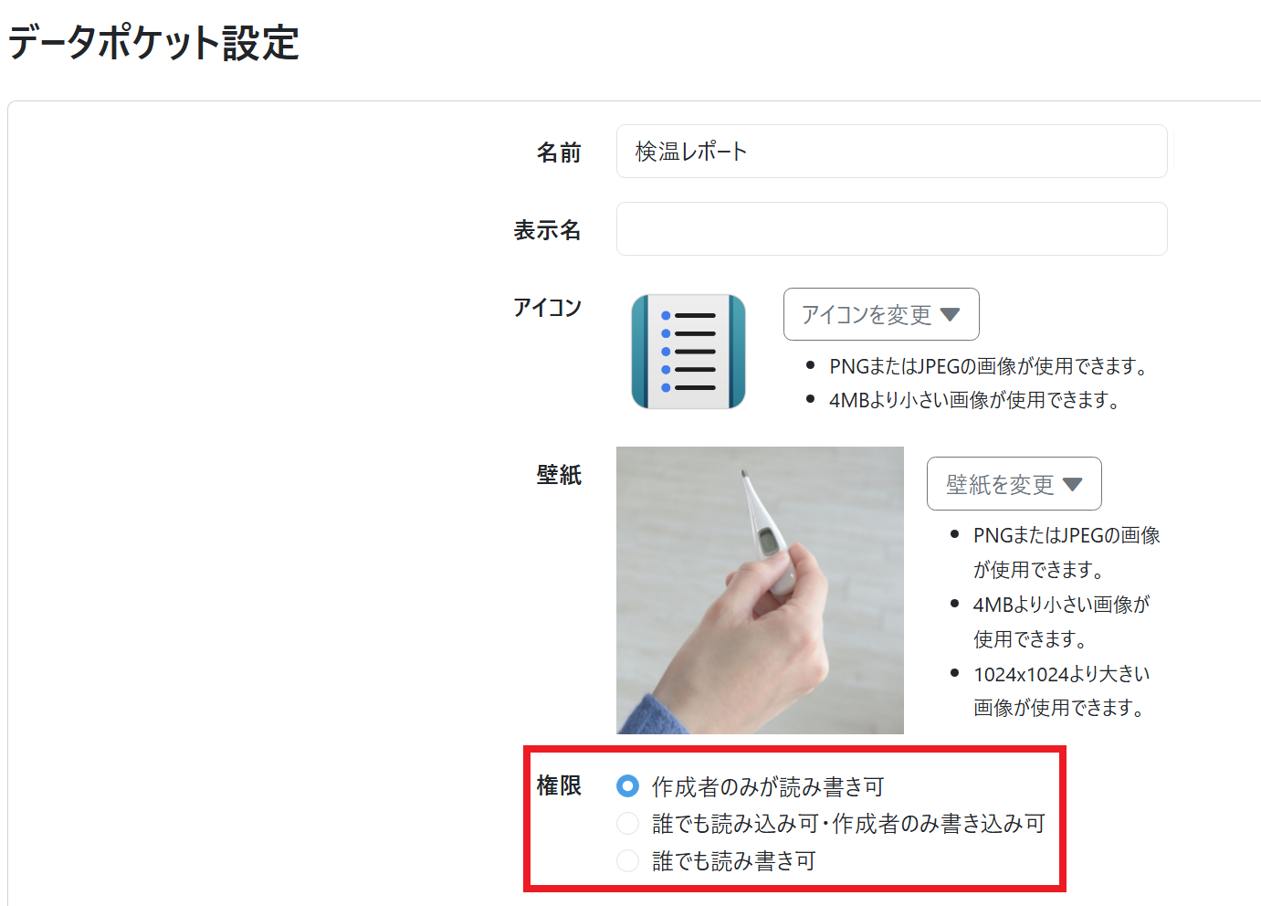 設定画面で権限を設定します。データポケットの設定については、ガイド「データポケットの設定」をご参照ください。